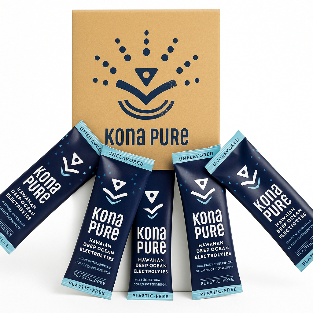 Kona Pure Deep Ocean Electrolytes delivers pure mineral hydration drawn from pristine deep ocean water, sourced 2,200 feet below the surface off the Kona Coast of Hawaiʻi. Naturally balanced by nature and refined by solar energy, each stick pack provides a 3:1 sodium-to-potassium ratio designed to mirror the body’s optimal hydration needs.